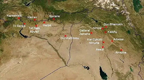 As cidades mais importantes da Assíria, todas situadas no território do atual Iraque, eram Assur, atualmente Xarcate; Nínive, da qual os únicos vestígios que indicam sua localização são dois grandes teis, Quiunique (Quyunyik) e Nabi Iunas; Calcu (Ninrude) e Dur Sarruquim, atualmente Jursabade. Nínive, às margens do Tigre, foi a capital assíria durante o apogeu (705–612 a.C.). No entanto, escavações indicam um início de aldeamento e povoação no período calcolítico, por volta de 6 000 a.C. Outra cidade-estado da Assíria de grande importância política e econômica foi Carquemis, antiga capital do reino hitita do século XII a.C.. A leste da Assíria se encontram os montes Zagros; ao norte, um escalão de platôs conduz ao maciço armênio; a oeste se estende a planície da Mesopotâmia. Ao sul se encontrava o país conhecido como Sumer, e Acádia e mais tarde Babilônia.[carece de fontes]