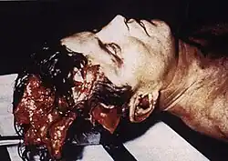 Uma fotografia da cabeça do presidente, tirada durante uma autópsia no Hospital Naval de Bethesda; a natureza da lesão pode corresponder ao uso de uma bala com efeito explosivo, a chamada "Dum Dum".[19] | |||