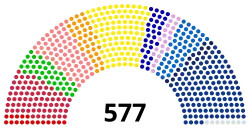 A Assembleia Nacional é composta por 577 membros, denominados députés (ou deputados) e eleitos através do sistema a duas voltas, sendo que cada um representa uma circunscrição eleitoral (distrito). Dentre os 577 assentos, 289 são necessários para estabelecer uma maioria da câmara. O partido com maior número de assentos elege o Presidente da Assembleia, que deverá presidir as sessões com o auxílio de uma mesa diretora. Seguindo uma tradição originária da Nacional Constituinte de 1789, os deputados aliados à ideologia esquerdista sentam-se à esquerda da tribuna, enquanto os aliados à ideologia direitista mantém-se à direita da tribuna.