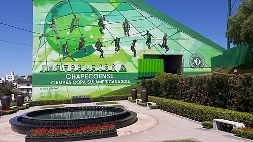 Associação Chapecoense de Futebol, mais conhecida apenas como Chapecoense, é um clube de futebol brasileiro sediado na cidade de Chapecó, Santa Catarina. Foi fundada em 10 de maio de 1973, com o objetivo de restaurar o futebol na cidade. Sua origem está ligada ao fato de que, na década de 1970, a região possuía apenas alguns times amadores, sendo inexpressiva em relação ao futebol profissional.[5] Com o propósito de reverter esta situação, alguns desportistas, jovens apaixonados pelo esporte, decidiram se reunir para criar um time de futebol profissional para a cidade. De maneira geral, pode-se dizer que a Chapecoense, posteriormente um dos mais bem-sucedidos do futebol catarinense, surgiu da união dos clubes Atlético Chapecoense e Independente.[6][7]