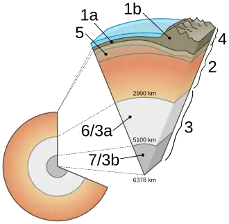 ![]() Corte do interior terrestre, do núcleo para a exosfera. Sem escala. |