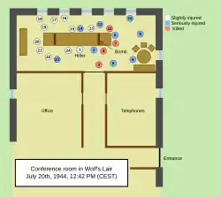 O coronel Stauffenberg colocou a única bomba armada dentro de sua pasta e, com a assistência involuntária do major Ernst John von Freyend, entrou na sala de conferência, onde estavam Adolf Hitler e vinte oficiais, posicionando a pasta sob a mesa, perto de Hitler.[35][36] Após alguns minutos, Stauffenberg recebeu uma ligação planejada e deixou a sala. Presume-se que o coronel Heinz Brandt, que estava ao lado de Hitler, tenha usado o pé para mover a pasta, empurrando-a para trás da perna da mesa de conferência. Isso acabou desviando involuntariamente a explosão de Hitler, mas resultou na perda de uma das pernas de Brandt e em sua morte quando a bomba detonou.[1]