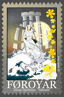 Há uma ambivalência semelhante nas seis estrofes do poema "Atlântida" (1917) do poeta dinamarquês Janus Djurhuus, onde uma celebração do renascimento linguístico das Ilhas Faroé lhe confere um pedigree antigo ao ligar o grego à lenda nórdica. No poema, uma figura feminina que surge do mar tendo como pano de fundo palácios clássicos é reconhecida como uma sacerdotisa de Atlântida. O poeta recorda “que as Ilhas Faroé ficam ali no Oceano Atlântico Norte / onde antes ficavam as terras sonhadas pelo poeta”, mas também que na crença nórdica tal figura só aparece para quem está prestes a afogar-se.[107]