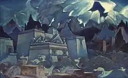 A representação artística mais dramática da catástrofe foi Terror Antiquus (1908), do pintor russo Léon Bakst, embora não mencione diretamente Atlântida. É uma vista do topo de uma montanha de uma baía rochosa aberta pelo mar, que avança para o interior em torno das altas estruturas de uma cidade antiga. Um raio atravessa a metade superior da pintura, enquanto abaixo dela ergue-se a figura impassível de uma deusa enigmática que segura uma pomba azul entre os seios. Viacheslav Ivanov identificou o tema como Atlântida em uma palestra pública sobre a pintura de Bakst em 1909, ano em que a obra foi exibida pela primeira vez. Sua opinião foi seguida por outros comentaristas nos anos seguintes.[122]