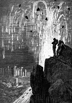 E a ilha de Atalantes [ortografia do tradutor; original: "Ἀτλαντίς"] que era maior que a África e a Ásia, como diz Platão em Timeu, em um dia e uma noite foi inundada pelo mar em consequência de um extraordinário terremoto e desapareceu repentinamente, tornando-se mar, de fato não navegável, mas cheio de abismos e redemoinhos.