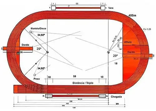 - ↑ As provas que se disputam na pista coberta são: 60 metros, 60 metros com Barreiras, 200, 400, 800, 1500 e 3000 metros e provas de marcha atlética, nas corridas, lançamento do peso, salto em altura, vara, comprimento e triplo.