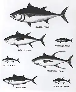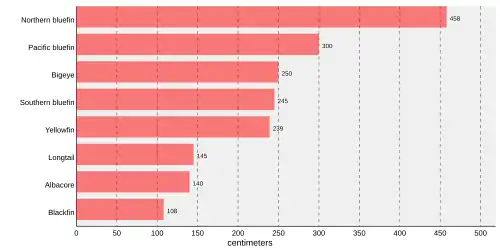 Tamanho relativo das espécies de atum, com a espécie Thunnus thynnus (topo) com cerca de 8 pés (2,4m) de comprimento.