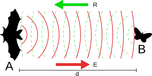 Morcegos, baleias, golfinhos e musaranhos orientam-se a partir de reflexões fracas de sons emitidos por eles mesmos, processo conhecido como ecolocalização. Durante o voo, morcegos emitem sons entre 25 000 e 50 000 Hz, inaudíveis aos seres humanos, e sua reflexão o permite identificar e desviar de obstáculos. Altas frequências permitem uma precisão direcional maior, além de possibilitarem a reflexão por objetos menores.[43] Musaranhos também usam a localização, a partir de pulsos sonoros de curta duração e alta frequência.[44]