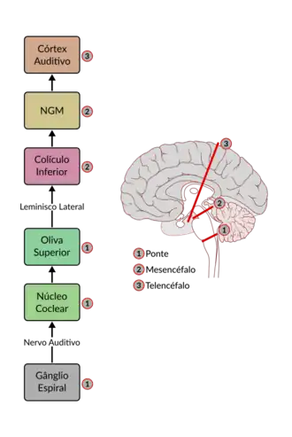 Os axônios aferentes do colículo inferior chegam ao encéfalo e se conectam ao núcleo geniculado medial do tálamo.[10] Por fim, a via segue através da radiação auditiva até o córtex auditivo, situado majoritariamente no giro superior do lobo temporal.[9]