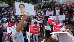 Protestos pela democracia se seguiram nas semanas seguintes, reprimidos violentamente pelas Forças Armadas. A Associação de Ajuda a Presos Políticos informou que 570 pessoas haviam sido mortas pelas forças de segurança.[46][47] Aung San Suu Kyi, colocada sob prisão domiciliar, enfrenta acusações de violação de uma lei sobre telecomunicações, incitação à desordem pública e por se encontrar na posse de dois rádios de comunicação que teriam sido importados ilegalmente e usados sem permissão.[46][48]