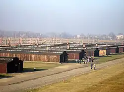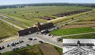 ![]() Vista aérea da entrada para Auschwitz II-Birkenau, o campo de extermínio do complexo de Auschwitz. Patrimônio Mundial da UNESCO | |