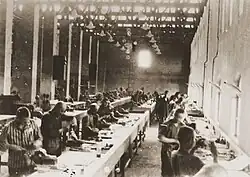 Após a chamada e a contagem, eles caminhavam até o local de trabalho, em grupos de cinco, vestindo uniforme listrado, sem roupas de baixo e usando sapatos de madeira sem meia, muitas vezes de tamanhos menores que seus pés, o que causava grandes dores. Uma orquestra de prisioneiras, a Orquestra Feminina de Auschwitz,[35] era forçada a tocar grotescamente uma música alegre, à medida que os prisioneiros passavam pelos portões a caminho do trabalho.[34]:184 Esta orquestra foi criada pela supervisora-SS do campo feminino, Maria Mandel[36] que, por suas atrocidades, ficou conhecida como A Besta.[36] Os kapos eram os responsáveis pelo comportamento dos prisioneiros durante o trabalho, supervisionados por guardas da SS. A jornada durava 12 horas no verão e um pouco menos no inverno e não havia períodos de descanso durante o dia. Um prisioneiro era designado para as latrinas, para vigiar o tempo que os demais gastavam para esvaziar as bexigas e os intestinos.[5]:20-21