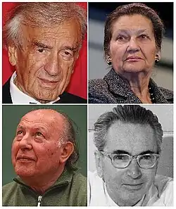 ![]() esquerda para direita, no sentido horário: Elie Wiesel, Simone Veil, Viktor Frankl e Imre Kertész: quatro sobreviventes de Auschwitz que se tornaram famosos no pós-guerra |