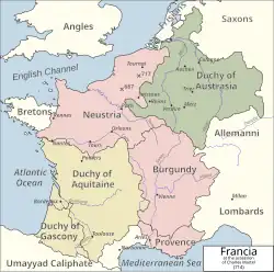 Mapa do Reino Franco em 714, onde a Austrásia destaca-se em verde.Sob o domínio da Nêustria - (679-715)