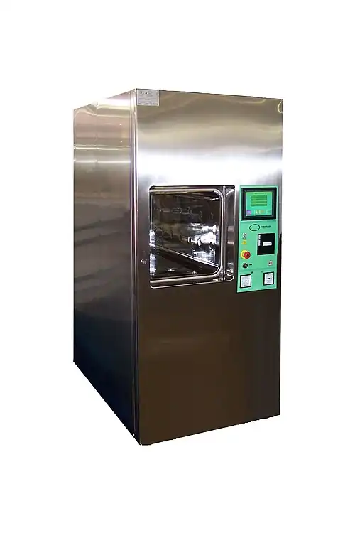 A autoclave é um equipamento no qual o material a ser esterilizado é colocado de forma a fazê-lo entrar em contato com o vapor de água em altas temperaturas e pressão por um tempo determinado. A ação combinada da temperatura, pressão e umidade promovem a termocoagulação e desnaturação de proteínas enzimáticas e estruturais dos microrganismos, causando sua morte. Consiste em um cilindro metálico, que pode ser tanto horizontal como vertical, que possui uma resistência interna cuja função é aquecer a água; uma tampa com parafusos para fechá-la hermeticamente, válvulas de segurança e para saída de ar; um indicador de temperatura e pressão e controle de temperatura.[2] Desse modo, é trivial que o material a ser autoclavado seja resistente às temperaturas utilizadas. A esterilização por autoclave é um dos processos mais comuns em laboratórios, hospitais, empresas e indústrias sendo um método eficiente, rápido e econômico utilizado para esterilizar materiais termorresistentes.[2] Na prática laboratorial, os meios de cultura antes de serem usados precisam ser esterilizados pelo aquecimento do meio em uma autoclave.[3] Dentre suas vantagens, pode-se citar alta eficiência da esterilização; equipamentos de simples operação e de baixo custo. Contudo também apresenta algumas desvantagens como a manutenção do volume dos resíduos tratados, geração de maus odores e aerossóis não patogênicos, além de precisar de recipientes termorresistentes que tem custo relativamente elevado.