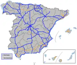 Com 15 152 km (em 2008), a rede de autoestradas espanhola é a quarto maior do mundo em comprimento, depois da dos Estados Unidos, China e Canadá.[34] As autopistas são especificamente reservadas para viagens de automóvel, onde os limites de velocidade gerais são definidos pela lei espanhola entre 60–120 km/h. Limites específicos podem ser impostos com base na meteorologia ou nas condições de tráfego da rodovia. A legislação espanhola exige o fornecimento de uma rota alternativa para os veículos mais lentos. Muitas das autoestradas do país, mas não todas, contam com pedágios.