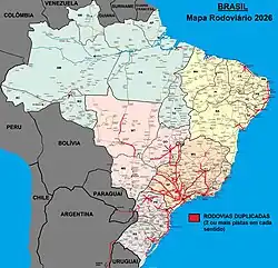 Sistema rodoviário brasileiro, com as rodovias duplicadas destacadas em vermelho