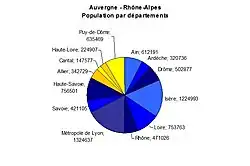 População por departamento na região Auvérnia-Ródano-Alpes em 2012 (em azul, os departamentos de Ródano-Alpes; em amarelo e laranja, os departamentos de Auvérnia)