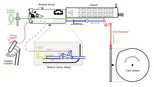 O canhão de tiro frontal em uma aeronave de configuração por tração (com a hélice no nariz) fornecia alguma capacidade ofensiva — a montagem de uma metralhadora disparando na retaguarda de um avião trator de dois lugares proporcionava capacidade defensiva. Havia uma necessidade óbvia de algum meio para disparar uma metralhadora a partir de uma aeronave do tipo "tração", especialmente de uma das aeronaves pequenas e leves de "reconhecimento", adaptadas de pilotos do pré-guerra, que deveriam realizar a maioria das funções de combate aéreo para o resto da guerra. Pareceria mais natural posicionar a arma entre o piloto e a hélice, disparando na linha direta de vôo, para que a mira pudesse ser feita "apontado a aeronave". Também era importante que a culatra da arma estivesse facilmente acessível ao piloto, para que ele pudesse evitar os congestionamentos e paradas a que as primeiras metralhadoras estavam sujeitas. No entanto, isso apresentava um problema óbvio: uma porcentagem de balas disparadas "livremente" através de uma hélice girando atingirá as pás, com resultados previsíveis. Os primeiros experimentos com metralhadoras sincronizadas foram realizados em vários países antes da guerra. Franz Schneider, então trabalhando para a Nieuport na França, mas depois trabalhando para a L.V.G. na Alemanha, patenteou uma engrenagem de sincronização em 15 de julho de 1913. Uma das primeiras engrenagens russas foi projetada por um tenente Poplavko: os irmãos Edwards na Inglaterra projetaram o primeiro exemplar britânico, e a empresa Morane-Saulnier também estava trabalhando no problema em 1914. Todos esses primeiros experimentos falharam em atrair a atenção oficial, em parte devido à inércia oficial e em parte devido às falhas nas primeiras engrenagens de sincronização, que incluíam balas ricocheteando perigosamente e hélices se desintegrando.[13] A metralhadora Lewis usada em muitas aeronaves aliadas era quase impossível de sincronizar devido à taxa de tiro irregular devido ao seu ciclo de disparo de ferrolho aberto. Algumas aeronaves RNAS, incluindo Bristol Scouts, tinham uma metralhadora Lewis não sincronizada montado na fuselagem, posicionada para disparar diretamente através do disco da hélice, no entanto, estes frequentemente não eram sincronizados. Em vez disso, as lâminas da hélice foram reforçadas com fita para manter a madeira unida em caso de colisão, e contava com o fato de que as chances de um único disparo atingir uma lâmina eram de menos de 5%, então, se rajadas curtas fossem usadas, isso oferecia um expediente temporário, mesmo que não fosse uma solução ideal.