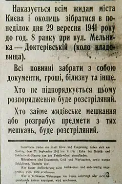 | “ | Ordena-se a todos os judeus residentes de Kiev e suas vizinhanças que compareçam à esquina das ruas Melnyk e Dokterivsky, às 8 horas da manhã de segunda-feira, 29 de setembro de 1941 portando documentos, dinheiro, roupas de baixo, etc. Aqueles que não comparecerem serão fuzilados. Aqueles que entrarem nas casas evacuadas por judeus e roubarem pertences destas casas serão fuzilados. | ” |