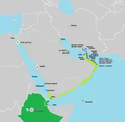 Presença portuguesa no golfo Pérsico. Verde - possessões e principais cidades. Verde escuro - aliados ou sob influência do Império Português