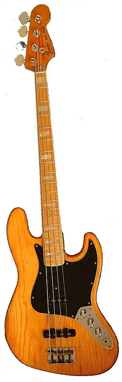 Um baixo fretless e suas cordas; note as marcações ao lado do braço para auxiliar o músico a encontrar o tom da nota corretamente.