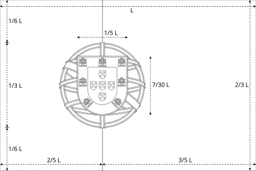 Verticalmente centrado sobre a esfera, está o escudo de Portugal. A sua altura e largura são iguais a 710 e 610 do diâmetro da esfera, respetivamente. O escudo está posicionado de forma a que os seus limites se cruzem com a esfera: