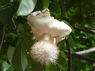 As flores são hermafroditas, actinomorfas, até 10 cm de comprimento, com pétalas brancas.