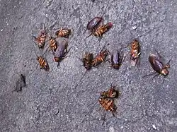 • Blatella germanica (barata-alemã): cosmopolita (temperatura preferida: 30 °C); tamanho: 10–15 mm de comprimento; originária da região oriental da África; principalmente uma praga domiciliar,[29] mas que em noites quentes pode ir para o peridomicilio; comum em cozinhas e restaurantes; é a praga mais importante dentre as baratas, devido: alto potencial reprodutivo (sendo que a resistência a determinado inseticida se prolifera rapidamente), pela fêmea carregar a ooteca durante quase todo o período de incubação dos ovos (depositando-a em local favorável para o desenvolvimento ninfal) e pelo tamanho diminuto podendo se esconder em locais inacessíveis à ação dos inseticidas; período de incubação dos ovos: aproximadamente 17 dias; período de desenvolvimento das ninfas: 38-40 dias com 5 a 6 mudas (machos) e 40-60 dias com 6 a 7 mudas (fêmeas); longevidade dos adultos: 4 meses (machos) e 6 meses (fêmeas); as fêmeas produzem de 4 a 8 ootecas, com cada ooteca apresentando de 30 a 40 ovos.[29][30]