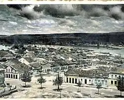 Da esquerda para direita vista panorâmica da cidade, o Rio Grande, Cidade vista de cima, vista da cidade a partir da BR-242, Catedral São João Batista