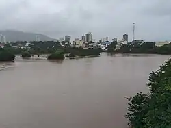 Rio Grande visto de cima da ponte Ciro Pedrosa em agosto de 2017 durante a época mais seca do ano; imagem do mesmo ângulo capturada durante a cheia do rio, consequência das chuvas que atingiram todo o estado em dezembro de 2021[57][58]