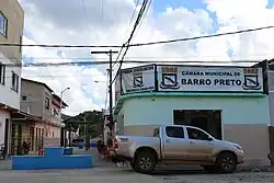 Prefeitura Municipal de Barro Preto, em 2021 Fachada de uma drogaria à direita e ponto de venda de passagens de ônibus da Rota Transportes à esquerda Câmara municipal Agência dos Correios Edifício da Igreja Católica, na Rua Souza Correia Quadra esportiva Hospital e Maternidade Nossa Senhora da Conceição Ponto de ônibus | |