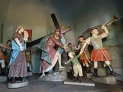 Dentro desse espírito, na escultura é de assinalar o desenvolvimento de um gênero de composição grupal chamado de "sacro monte", concebido pela Igreja e rapidamente difundido por outros países. Trata-se de um conjunto que reproduz a Paixão de Cristo ou outras cenas piedosas, com figuras policromas em atitudes realistas e dramáticas em um arranjo teatralizado, e destinadas a comover o público.[71] Deste instrumental pedagógico católico fazia parte ainda a construção de cenários nos quais eram inseridas as estátuas a fim de criar ainda maior ilusão de realidade, numa concepção verdadeiramente teatral. Às vezes tais grupos eram confeccionados de forma a poderem ser movidos e transportados sobre carros em procissões, criando-se uma nova categoria escultórica, a das estátuas de roca em madeira. Para aumentar o efeito mimético muitas possuíam membros articulados, para que pudessem ser manipuladas como marionetes, assumindo uma gestualidade eficiente e evocativa, variável de acordo com o progresso da ação cênica. Recebiam roupagens que imitavam as de pessoas vivas, e pintura que assemelhava à carne humana. E para maior ilusão seus olhos podiam ser de vidro ou cristal, as cabeleiras naturais, as lágrimas de resina brilhante, os dentes e unhas de marfim ou osso, e a preciosidade do sangue das chagas dos mártires e do Cristo flagelado podia ser enfatizada com a aplicação de rubis. Assim, nada melhor para coroar a participação do público devoto na recriação da realidade mística do que permitir que a ação se desenrolasse em espaço aberto, na procissão, onde a movimentação física do fiel ao longo do trajeto poderia propiciar a estimulação da pessoa como um todo, diferentemente da contemplação estática diante de uma imagem em um altar. Nos casos em que o "sacro monte" deveria ser levado às ruas, usualmente era simplificado a uma sugestão de rochas ou numa gruta. Conforme a ocasião, a gruta ou rocha poderiam representar o Monte Sinai, o Monte Tabor, o Monte das Oliveiras, a Gruta da Natividade, a rocha da Tentação de Cristo ou outros locais impregnados de significado. Algumas vezes o cenário rochoso era substituído por outro arquitetônico, especialmente após o trabalho de Andrea Pozzo, codificador da perspectiva ilusionística arquitetônica que foi largamente empregada na decoração de templos católicos. Com os mesmos fins práticos, para aliviar o peso do conjunto, as imagens eram entalhadas apenas parcialmente, com acabamento só nas partes que deveriam ser vistas pelo público, como as mãos, cabeça e pés, e o restante do corpo consistia em uma simples estrutura de ripas ou armação oca coberta pela roupa de tecido.[72]