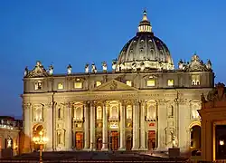 A Basílica de São Pedro é uma igreja do estilo renascentista localizada em Roma a oeste do Rio Tibre, perto da colina Janículo e do Mausoléu de Adriano. É através da Praça de São Pedro que a basílica é abordada, onde se destacam duas estátuas de 5,55 metros de altura dos apóstolos do século I Pedro e Paulo. O espaço central é dominado tanto no interior como no exterior por um dos maiores domos do mundo. A sua cúpula domina o horizonte de Roma, elevando-se a uma altura de 136,57 metros.[15][16] Apesar dos primeiros projectos desenvolvidos repercutirem para uma estrutura de planta centralizada, o que é ainda evidenciado na sua arquitectura, a basílica é cruciforme, com uma alongada nave de cruz latina. A entrada é feita através de um nártex, que se estende por toda a frente do edifício.[15]