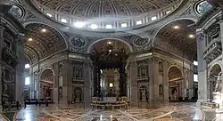 Especificamente classificada pela UNESCO, catalogada e preservada como Património Mundial da Humanidade, a Basílica de São Pedro foi considerada o maior projecto arquitectónico da sua época e continua a ser um dos monumentos mais visitados e celebrados do mundo. Foi provado que sob o altar da basílica está enterrado São Pedro[nt 1] (de onde provém o nome da basílica) um dos doze apóstolos de Jesus e o primeiro Papa e, portanto, o primeiro na linha da sucessão papal. Por esta razão, muitos Papas, começando com os primeiros, têm sido enterrados neste local.[9] Sempre existiu um templo dedicado a São Pedro em seu túmulo, inicialmente extremamente simples, com o passar do tempo, os devotos foram aumentando o santuário, culminando na atual basílica. A construção do atual edifício, no local da antiga basílica erguida pelo imperador Constantino, foi inicialmente planeada no século XV pelo Papa Nicolau V e depois pelo Papa Júlio II para substituir a antiga; teve início em 18 de abril de 1506 e foi concluída em 18 de novembro de 1626,[10] sendo consagrada imediatamente pelo Papa Urbano VIII. A basílica é um famoso local de peregrinação, pelas suas funções litúrgicas e associações históricas e uma das sete igrejas de peregrinação de Roma. Foi projectada principalmente por Donato Bramante, Miguel Ângelo, e Carlo Maderno, com a praça e escultura de Gian Lorenzo Bernini, a Basílica de São Pedro é uma das obras mais conceituadas da arquitetura italiana renascentista.[11]