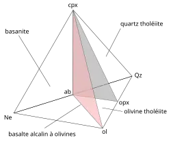 As várias tipologias de basalto podem ser representadas, com boa aproximação, no «tetraedro basáltico»[16] (ver figura) em função do seu grau de saturação em sílica. Naquele gráfico, os basaltos são classificados com base nos minerais que contenham e a divisão entre as várias categorias distribuídas pelos planos de saturação e sub-saturação. O plano de sub-saturação, com vértices Di-Ab-Fo é uma barreira térmica que, em qualquer condição de pressão, subdivide os basaltos em dois grupos que apresentam evolução diferente, tendendo a diferenciar-se sempre cada vez mais. O plano de saturação, com vértices Di-Ab-En por sua vez é uma barreira térmica apenas nas baixas pressões, sendo assim possível que um basalto olivínico evolva transformando-se num basalto toleítico.