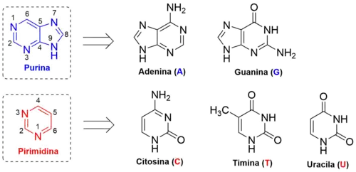 - Purinas (Adenina e Guanina), possuem duplo anel de átomos de carbono e derivam da purina.[1]