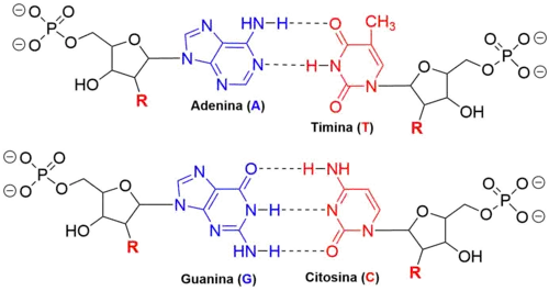 Encontrando-se o ADN em dupla hélice, as bases, se estáveis, emparelham-se com as respectivas bases complementares: adenina (A) com timina (T), citosina (C) com guanina (G). No DNA só aparecem as bases ATCG, onde (A) pareia com (T) através de duas ligações de hidrogênio (A=T) e (G) pareia com (C) através de três ligações hidrogênio (C≡G). Assim, o DNA apresenta razão estequiométrica de 1:1 para adeninas e timinas, citosinas e guaninas, e purinas e pirimidinas, as chamadas regras de Chargaff. A base uracila (U) só aparece no RNA, substituindo a timina e ligando-se com a adenina, também com duas ligações de hidrogênio (A=U).