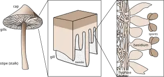 Esquema de um basidiocarpo típico, a estrutura reprodutiva dipóide de um basidiomiceto, mostrando o corpo de frutificação, himénio e basídios.