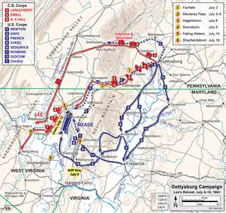 Em uma disputa sobre o uso das forças que defendiam a cidade de Harpers Ferry, o General Hooker ofereceu sua renúncia ao presidente Abraham Lincoln e ao General-em-Chefe Henry W. Halleck, que procuravam uma desculpa para se livrar dele, imediatamente aceitaram. Eles substituíram Hooker na manhã de 28 de junho pelo major-general George Gordon Meade, que até então servia como comandante do V Corpo do exército da União.[18]