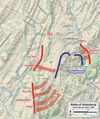 O plano de batalha do general Robert E. Lee para o dia 2 de julho exigia um ataque generalizado às posições de George Meade. Na direita, o Primeiro Corpo de exército de Longstreet estava se posicionando no flanco esquerdo das forças da União, voltado para o nordeste montado na estrada para Emmitsburg e com o objetivo enrolar a linha da União. A sequência de ataque começaria com uma investida das divisões dos generais John Bell Hood e Lafayette McLaws em um movimento de foice, seguido por um ataque frontal do major-general Richard H. Anderson (do Terceiro Corpo de exército do General A. P. Hill) um pouco mais ao norte.[46]