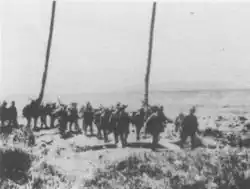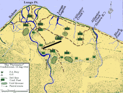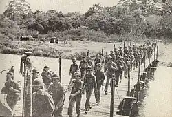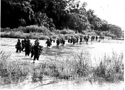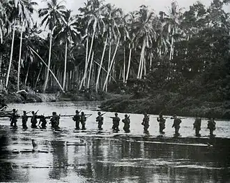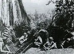 ![]() Fuzileiros navais americanos patrulhando as margens do rio Matanikau, em Guadalcanal, em setembro de 1942. | |||