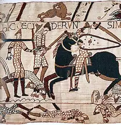 - ↑ A primeira menção registrada da tapeçaria é de 1476, mas é similar em estilo a ilustrações finais de manuscritos anglo-saxões e pode ter sido composta e executada na Inglaterra.[135] A tapeçaria agora é exibido no antigo Paço Episcopal em Bayeux, na França.[136]