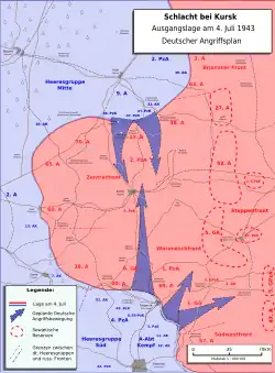 Em março, os planos se cristalizaram, o 9º Exército de Walter Model atacaria partindo de Orel em direção ao sul, enquanto o 4º Exército Panzer de Hermann Hoth e o Destacamento de Exército Kempf, sob o comando geral de Manstein, atacaria partindo de Kharkov em direção ao norte. Eles planejavam se encontrar perto de Kursk, mas se a ofensiva fosse boa eles teriam permissão para continuar em frente por sua própria iniciativa, com um plano geral para criar uma nova linha no Rio Don longe ao leste.