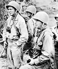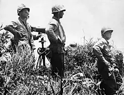 ![]() Dois fuzileiros navais do 2º Batalhão, 1º Regimento de Fuzileiros Navais durante os combates em Wana Ridge durante a Batalha de Okinawa, maio de 1945 | |||