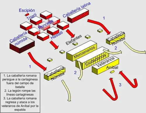 Cipião podia estar confiante de que seus romanos não iriam entrar em pânico com a carga dos elefantes, com o que Aníbal certamente contava para a fase inicial de batalha, e ele dava passos cuidadosos para que seu efeito fosse minimizado pela disposição usual da infantaria. Em vez de posicionar os manípulos (unidades de cento e vinte homens) da maneira normal, como num tabuleiro de damas, com os manípulos da segunda linha cobrindo os intervalos entre os manípulos da primeira linha, e assim por diante, como era procedimento padrão, Cipião posicionou-os um atrás do outro, de modo que houvesse espaços abertos transpassando o exército. Essas lacunas ele preencheu com tropas leves, de modo que pudessem atacar os elefantes quando avançassem e, ao mesmo tempo, se refugiar por trás dos legionários blindados quando necessário, deixando as lacunas vazias. Em sua ala esquerda, colocou a cavalaria romana comandada por Lélio, e à sua direita, os númidas de Massinissa.