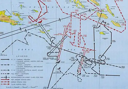 A 3 de maio, os aviões de reconhecimento baseados na Austrália avistaram os transportes japoneses concentrados ao largo da cabeça-de-praia de Tulagi, e Fletcher, no Yorktown, decidiu atacá-los. Antes do amanhecer de 4 de maio, 12 torpedeiros Devastator atacantes e 28 bombardeiros de mergulho Dauntless decolaram do Yorktown para o voo de 192 km sobre as montanhas de 1 800 m de Guadalcanal que os levaria a Tulagi. De acordo com os métodos da época, cada esquadrão voava para o alvo e atacava independentemente. Uma vez passadas as colinas cobertas de selva, os aviões-torpedeiros desceram ao nível do mar para os 20 km restantes até a baía.