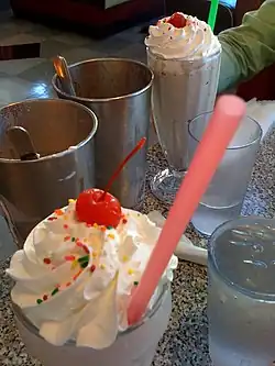 Quando a palavra milk-shake foi usada pela primeira vez na imprensa, em 1885, os milk-shakes eram uma bebida alcoólica com whisky.[6] Entretanto, por volta de 1900, o termo passou a ser usado para se referir a uma bebida batida feita de xarope de chocolate, morango ou baunilha. No início da década de 1900, as pessoas começaram a pedir pela nova bebida, frequentemente acompanhada de sorvete. Nos anos 1930, os milk-shakes se tornaram muito populares nas malt shops, típicos pontos de encontro de estudantes na época.