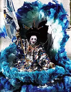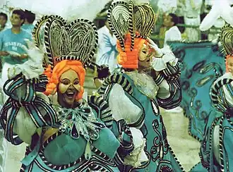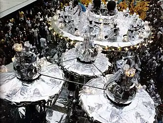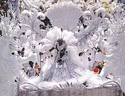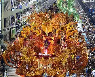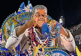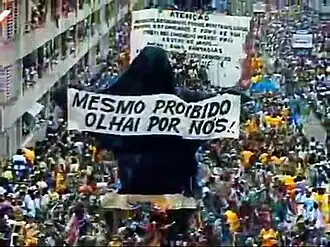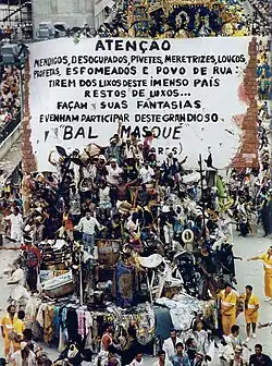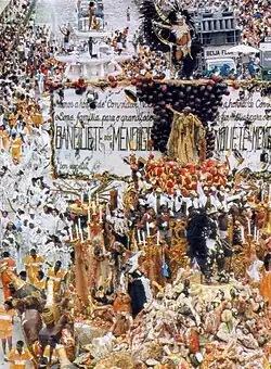 Criticado pelo excesso de luxo em seus carnavais, o carnavalesco Joãosinho Trinta decidiu dar uma respostar aos seus críticos com o enredo "Ratos e Urubus, Larguem Minha Fantasia". Acusado de não saber trabalhar com pouco dinheiro, Joãosinho preparou um desfile usando materiais baratos, sucata e sobras de carnavais anteriores.[129] O enredo apresentou uma crítica social utilizando o lixo como metáfora para questionar temas como política, sexo e religião.[130] Após um desentendimento com Joãosinho Trinta, o mestre-sala Élcio PV se desligou da Beija-Flor junto com sua esposa, Dóris.[101] Um concurso foi realizado para a escolha do novo casal de mestre-sala e porta-bandeira da escola, sendo vencido por Marco Aurélio e Rosária. A Beija-Flor foi a oitava e penúltima escola a se apresentar na segunda noite (segunda-feira) do Grupo 1 de 1989. No sábado de antevéspera do desfile, a 15.ª Vara Cível do Rio acatou um pedido da Arquidiocese do Rio de Janeiro para proibir a escola de desfilar com uma escultura do Cristo Redentor caracterizado de mendigo. O diretor de carnaval, Laíla, teve então a ideia de cobrir a escultura com um plástico preto e pendurar uma faixa com a inscrição "Mesmo proibido, olhai por nós!", transformando o carro abre-alas do desfile numa das imagens mais marcantes do carnaval contemporâneo.[131] Antes do desfile, uma nova decisão judicial liberou a escola de apresentar o "Cristo mendigo", como ficou conhecida a alegoria, mas Joãosinho decidiu manter a escultura coberta, alegando que "tiraram a proibição do papel, mas não do pensamento".[132] O diretor teatral Amir Haddad e seu grupo Tá na Rua foram responsáveis pela Comissão de Frente e por interpretar os mendigos do carro abre-alas.[133] A imprensa aclamou o desfile com adjetivos como "chocante", "inovador", "apoteótico", "incrível" e "revolucionário", listando a Beija-Flor entre as favoritas ao título de campeã.[134] O público presente no Sambódromo também aclamou a escola com aplausos e gritos de "campeã".[135] Em pesquisa realizada pela Rádio Globo com o público no Sambódromo, a Beija-Flor foi eleita a melhor escola das duas noites.[136] A Beija-Flor foi a campeã do Estandarte de Ouro, recebendo quatro prêmios: melhor escola; melhor enredo; Personalidade do Ano para Joãosinho Trinta; e melhor mestre-sala para Marco Aurélio.[137][138] "Ratos e Urubus" é comumente listado entre os melhores desfiles da história do carnaval carioca.[9][139][140][141]