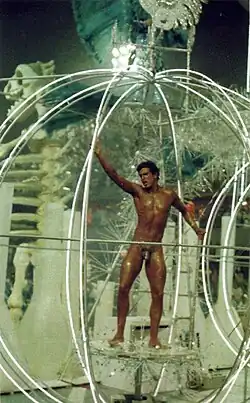 Paulo César Grande (Adão), Márcia Porto (Eva), Jorge Lafond (Madame Satã) e Jésus Henrique (O Criador) no abre-alas da Beija-Flor no carnaval de 1985.